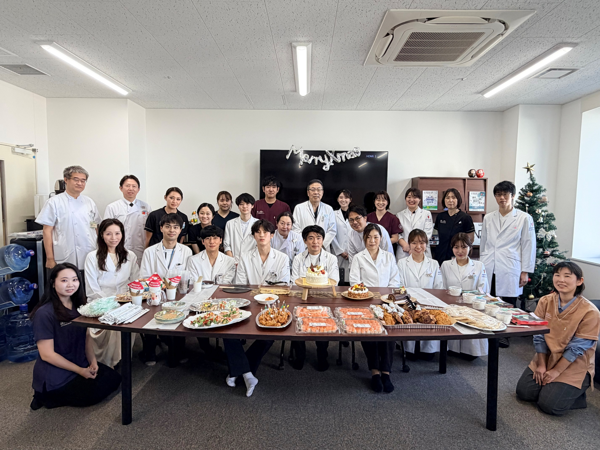 2025/12/22(月)数日早いですが、千葉大学大学院口腔科学のカンファレンスルームにて、研修医の先生、大学院生、文部教官、秘書さん、歯科衛生士さんも集まってクリスマス会を開催しました。秘書さんが企画・準備をしてくださり、記念に全員で集合写真を撮影しました。クリスマスソングは歌いませんでしたが、1年間の仕事や業務を労い、楽しいクリスマス会になりました!!