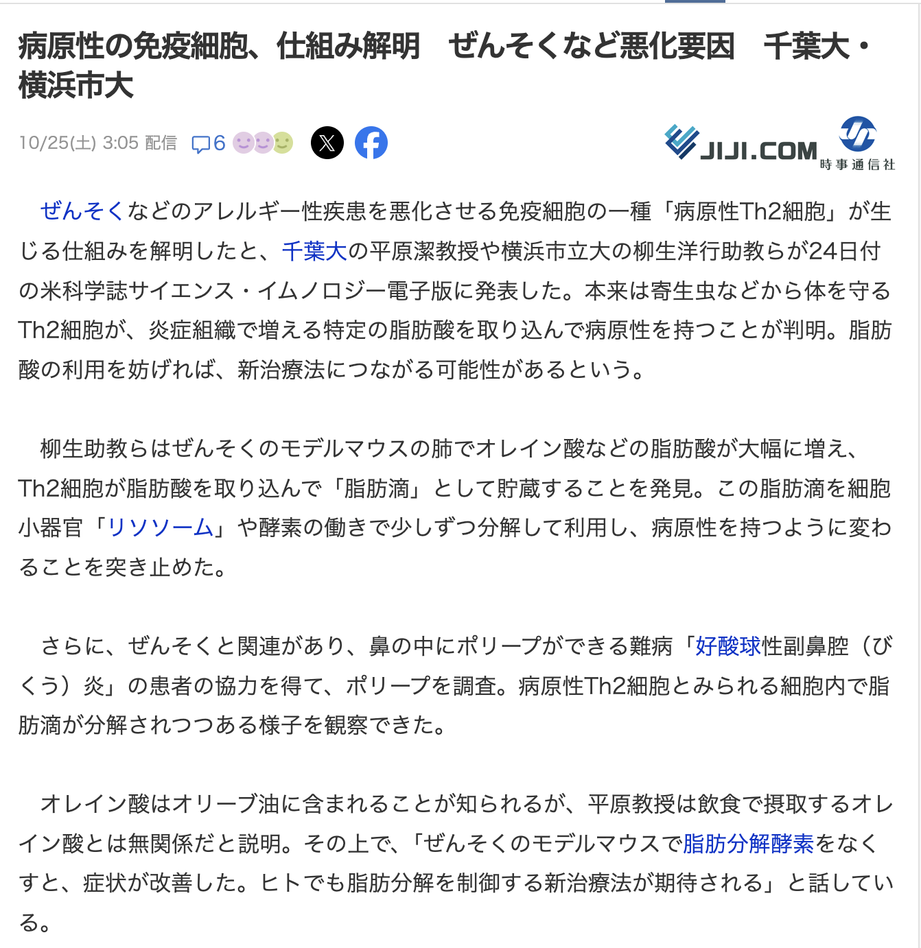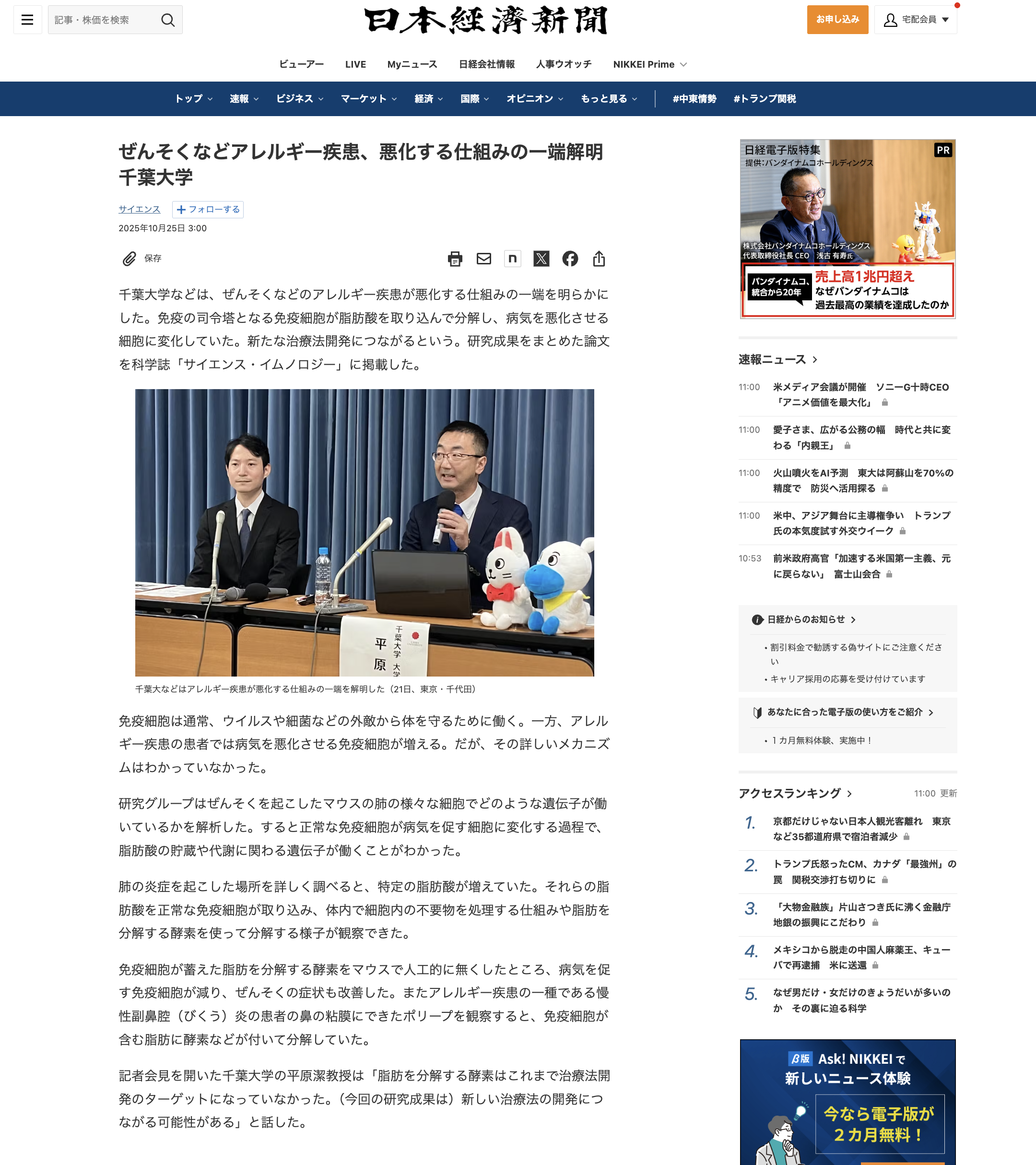 柳生洋行先生(現所属:横浜市立大学附属病院 呼吸器内科)の脂質代謝を介した病原性T細胞の誘導機構に関する研究論文が、Science Immunology誌に掲載されました。 千葉大学からプレスリリースを発表し、日本経済新聞、時事通信等のメディアに取り上げられました。
